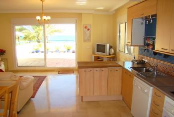 fitted kitchen with dishwasher and washing machine and a living room with dining area, satellite television